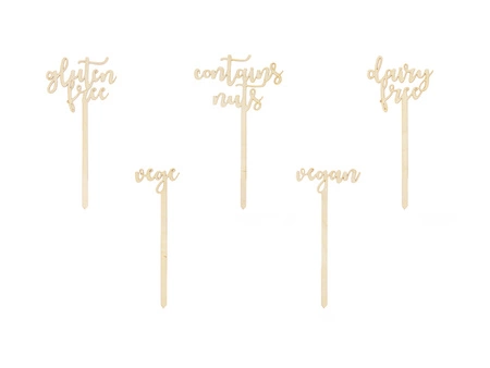 - Drewniane toppery na słodki stół, zestaw zawiera 5 topperów z napiami: Vege, Vegan, Dairy free, Contains nuts i Gluten free, wysokość ok. 14.5-16 cm.