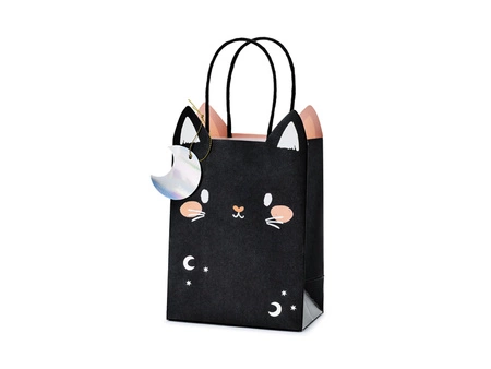 - Torebka na prezenty Kot w kolorze czarnym z kolorowym nadrukiem i zawieszka w kształcie księżyca, wymiary bez uchwytów ok. 8 x 14 x 18 cm.