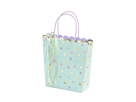 - Torebki na prezenty w kolorze miętowym z kolorowym i złotym metalizowanym nadrukiem, kolorowymi tasiemkami i nadrukiem w kolorze fioletowym w środku torebek, wymiary bez uchwytów ok. 22 x 23 x 8 cm.