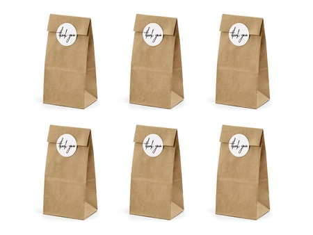 - Torebki na słodycze wykonane z papieru kraft, z 6 białymi naklejkami z napisem Thank you, wymiary po złożeniu ok. 8x18x6 cm. (1 op. / 6 szt.)