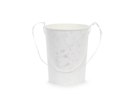 - Papierowe wiaderko na płatki do sypania, wysokość około 13 cm, średnica 9-11 cm. Wiaderko w kolorze białym z perłowym, błyszczącym nadrukiem w kwiatki zawiera w zestawie białą, satynową wstążkę o długości 50 cm.