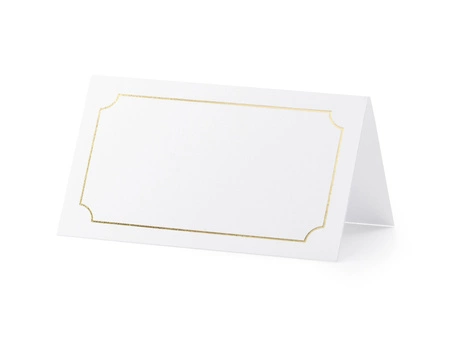 - Wizytówki na stół wykonane z papieru w kolorze białym, ze złotą metalizowaną ramką, wymiary po złożeniu ok. 9,5 x 5,5 cm. (1 op. / 10 szt.)