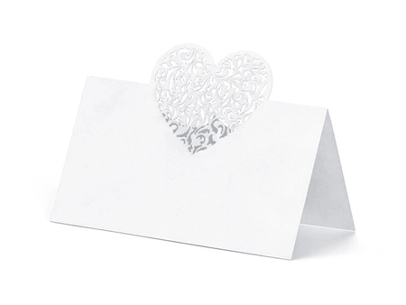 - Wizytówki na stół Serce z perłowego papieru w kolorze białym, z wyciętym wzorem, wymiary 9x6,5 centymetra. (1 op. / 10 szt.)