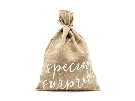 - Worek jutowy z białym nadrukiem i napisem Special Surprise, zestaw zawiera worek oraz ok. 1 m jutowego sznurka, wymiary ok. 40 x 55 cm.