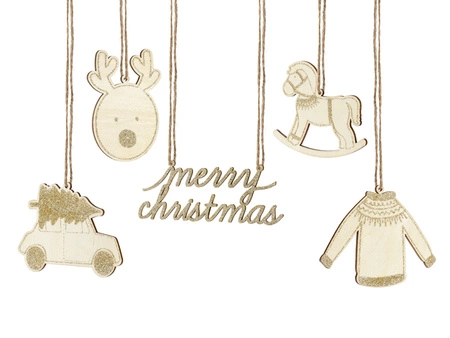 - Zawieszki dekoracyjne Święta wykonane z drewna z brokatem z jednej strony w kolorze złotym, zestaw zawiera 10 zawieszek (5 wzorów, po 2 zawieszki z każdego) i 2 m jutowego sznurka, wymiary zawieszek ok. 6.5-10 x 7-8.5 cm. (1 op. / 10 szt.)